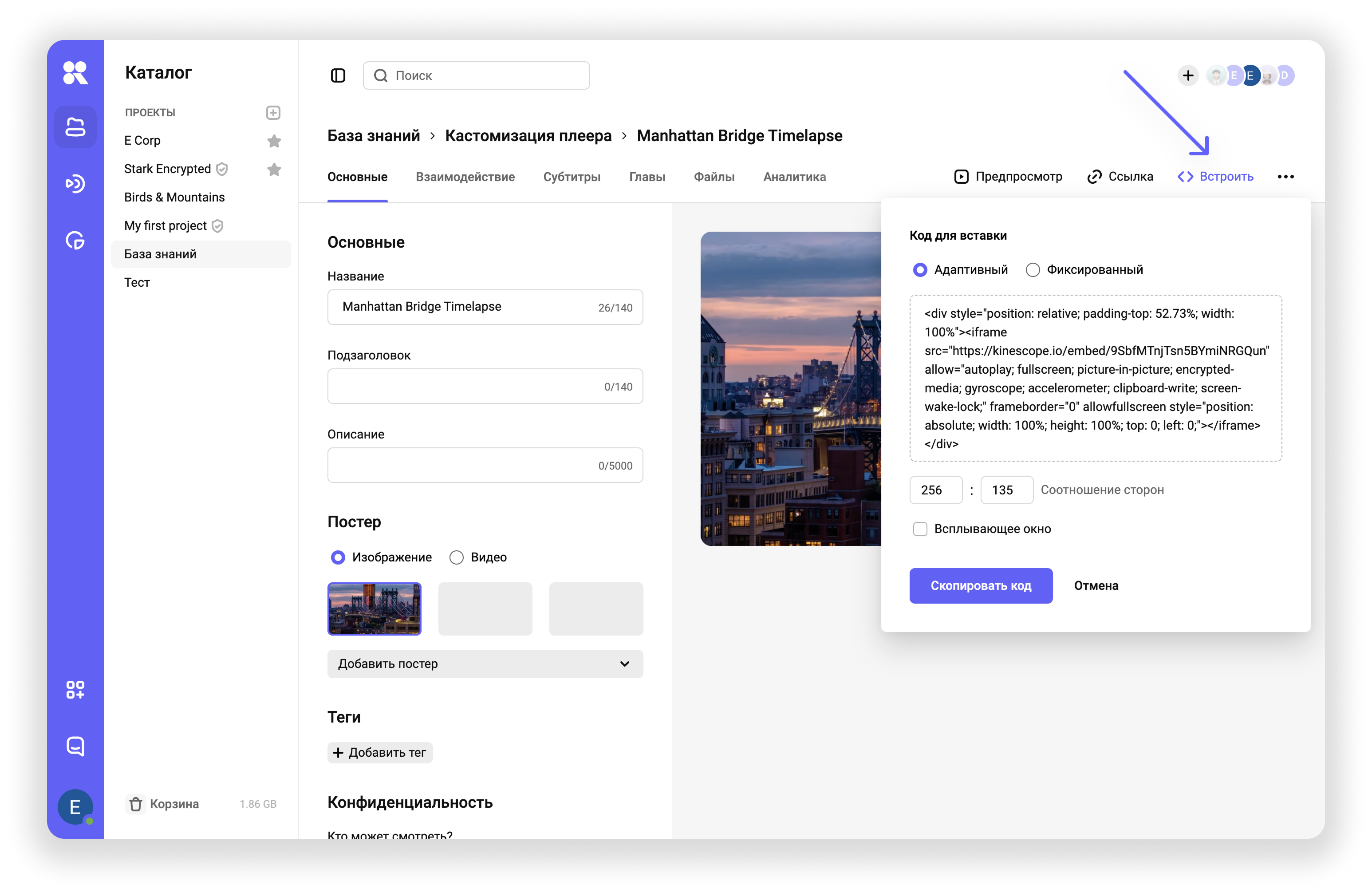 После установки плагина вы получаете доступ к инструментам работы с видео, которые Kinescope предоставляет через свою платформу.