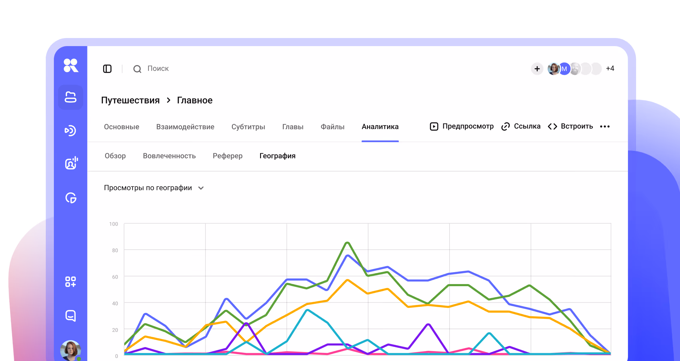 Получайте статистику по зрителям во время и после эфира: количество подключений, география, используемые устройства и многое другое.