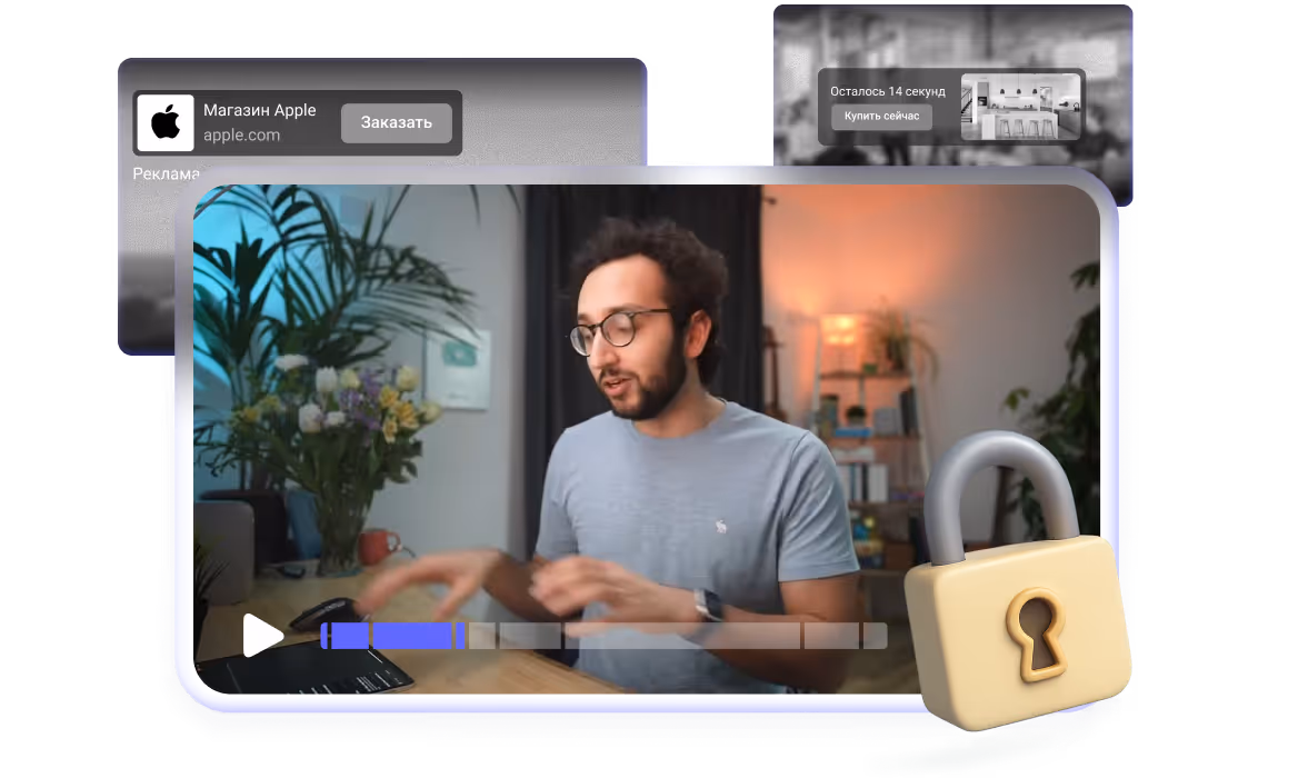 Видеопоток зашифрован: скачать видео через браузер или расширение не получится. Если кто-то всё-таки запишет экран, динамические водяные знаки помогут отследить источник утечки.